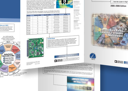 8 page booklet: product family brochure explaining functions and utilization of high quality semi conductor products of Analog Devices Inc. in Norwood, Massachusetts.