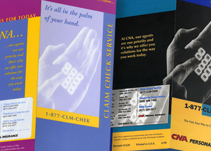 Flyers: two fold pamflet advertising the new phone service handeling claims at CNA insurance in Chicago, Illinios.